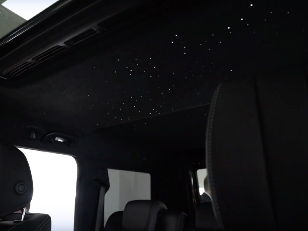 The GVE customs team then created a ‘Rolls Royce effect’ star headlining. This was done by removing the headlining and drilling several holes individually. Then optical fibres were pushed through the holes and trimmed to sit flush with the surface of the headlining. The fibres were then tied together and fed to a power supply followed by re-fitting the headlining to the car. The colour of the lights and the display pattern can also be changed with a remote control.